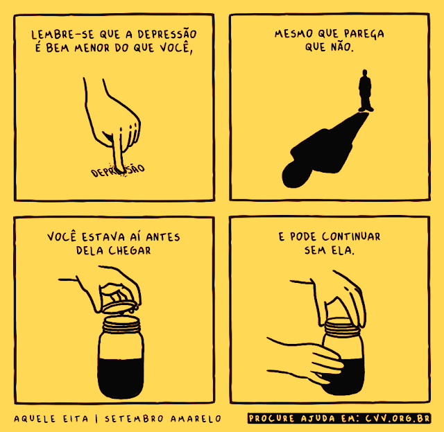 A mensagem transmitida pela imagem é de que a depressão é menor que você e que você pode continuar sem ela.